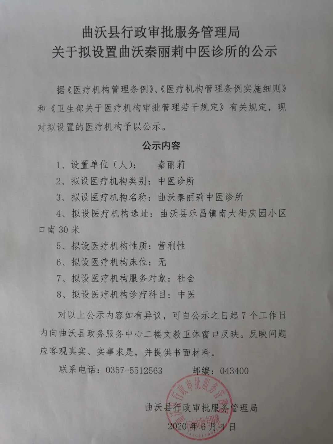 關(guān)于擬設(shè)置曲沃秦麗莉中醫(yī)診所的公示
