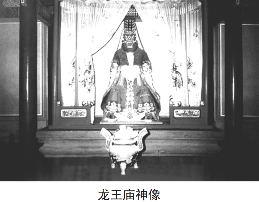 數(shù)日功夫,龍王廟建成了,它坐北向南,依山傍水,規(guī)模宏大,氣勢磅礴,廟中最北邊有正殿五間,前有獻殿三間,中有過廳五間,南有戲臺一座,戲臺兩邊建有東西兩個廟門,廟院中東西兩側還建走廊各十余間。龍王廟的正殿中有龍王爺塑像一座,中間兩根直通屋頂?shù)哪局嫌袃杀P木龍。建廟時,人們沒有忘記退去洪水的青龍兄弟,便把它倆的像雕成木龍,纏繞在這兩根木柱上,同龍王爺一起享受人們的祭祀。大殿東西兩側還塑有雷、電、火、雨、風、云、霧、雪八大金剛。塑像都有一人多高,身涂五彩,飄衣飛帶,威風凜凜。