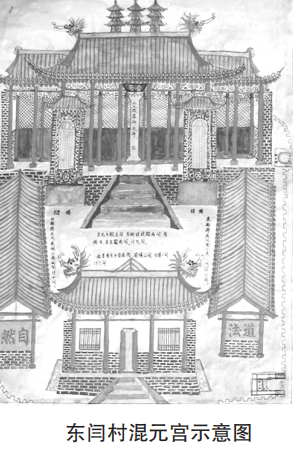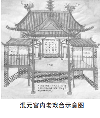在東同村因有老君傳道之說(shuō),老君與混元宮內(nèi)老戲臺(tái)示意圖 混元天尊又同為道教始祖,于是人們?cè)诩o(jì)念老君的同時(shí)又建了這座混元宮,使兩位道教始祖的神靈同駐村中,寄托著人們對(duì)道法的尊崇和對(duì)神道的敬仰之情。