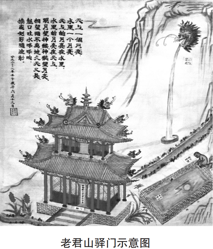 他從老君坡緩步而上,見這里山環(huán)水繞,風(fēng)景秀麗,心情十分愉悅。快到山頂時(shí),眼前出現(xiàn)了一座閣樓式的大山門,有道士將他迎入閣樓內(nèi)落坐。吃過茶后,他要道士引他去朝拜太上老君,道士說:“要拜老君,須更衣洗面方能顯示誠(chéng)意。”獻(xiàn)公隨即脫去戰(zhàn)袍、軍靴,換上素衣麻鞋,道士領(lǐng)他進(jìn)入山門,在一水池旁站下。道士先抬手指著不遠(yuǎn)處的一座土崖說:“主上請(qǐng)看那是什么?"