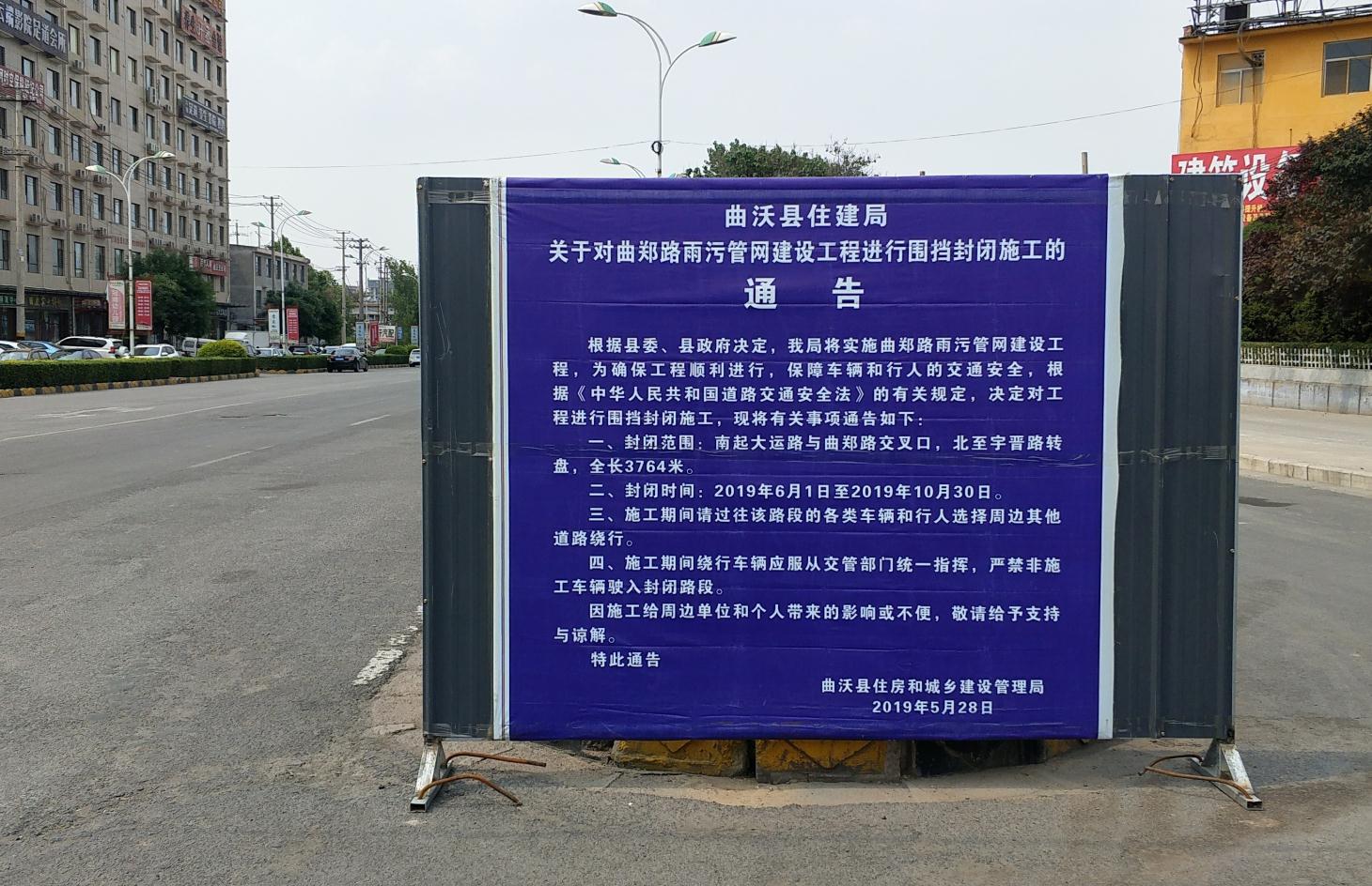 根據(jù)縣委、縣政府決定,我局將實施曲鄭路雨污管網(wǎng)建設工程,為確保工程順利進行,保障車輛和行人的交通安全,根據(jù)《中華人民共和國道路交通安全法》的有關規(guī)定,決定對工程進行圍擋封閉施工,現(xiàn)將有關事項通告如下: