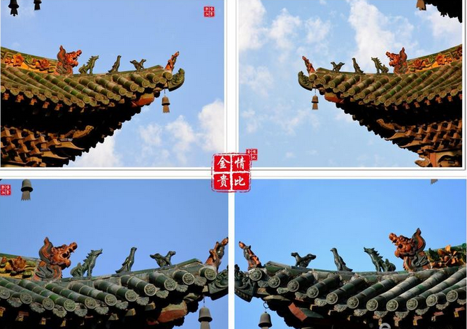 四牌樓建筑結(jié)構(gòu)為三重檐三層樓身,一、二層四面均面闊三間,進深三間。四牌樓造型奇待,為樓閣式與牌樓式相結(jié)合結(jié)構(gòu),牌坊上下坊,雀替,板件上雕有精美的淺浮雕塑,有較高的藝術(shù)價值。邊樓在額枋與柱上出穿插枋,出抱廈,使其檐突出圍檐,利用視覺原理,造成又一層疊檐的假象。三層檐利用很小空間,設(shè)置十字歇山頂,合理平衡層頂與出檐重。