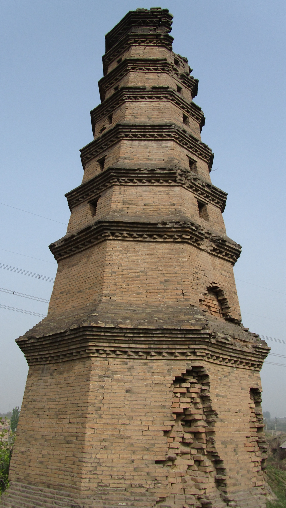 大明寶塔,位于史村鎮(zhèn)東寧村東南200米處。縣級(jí)文物保護(hù)單位。建于明代。大明寶塔座東向西,占地面積22.38平方米。寶塔為平面八角磚塔,每面長(zhǎng)2.1米,現(xiàn)存八層,高12米,周長(zhǎng)16.8米。第一層有高2米、寬0.7米的圈門。第二層有高0.9米、寬0.45米的圈門。第三層以上的四面均有方形小神龕。塔頂部塌毀。